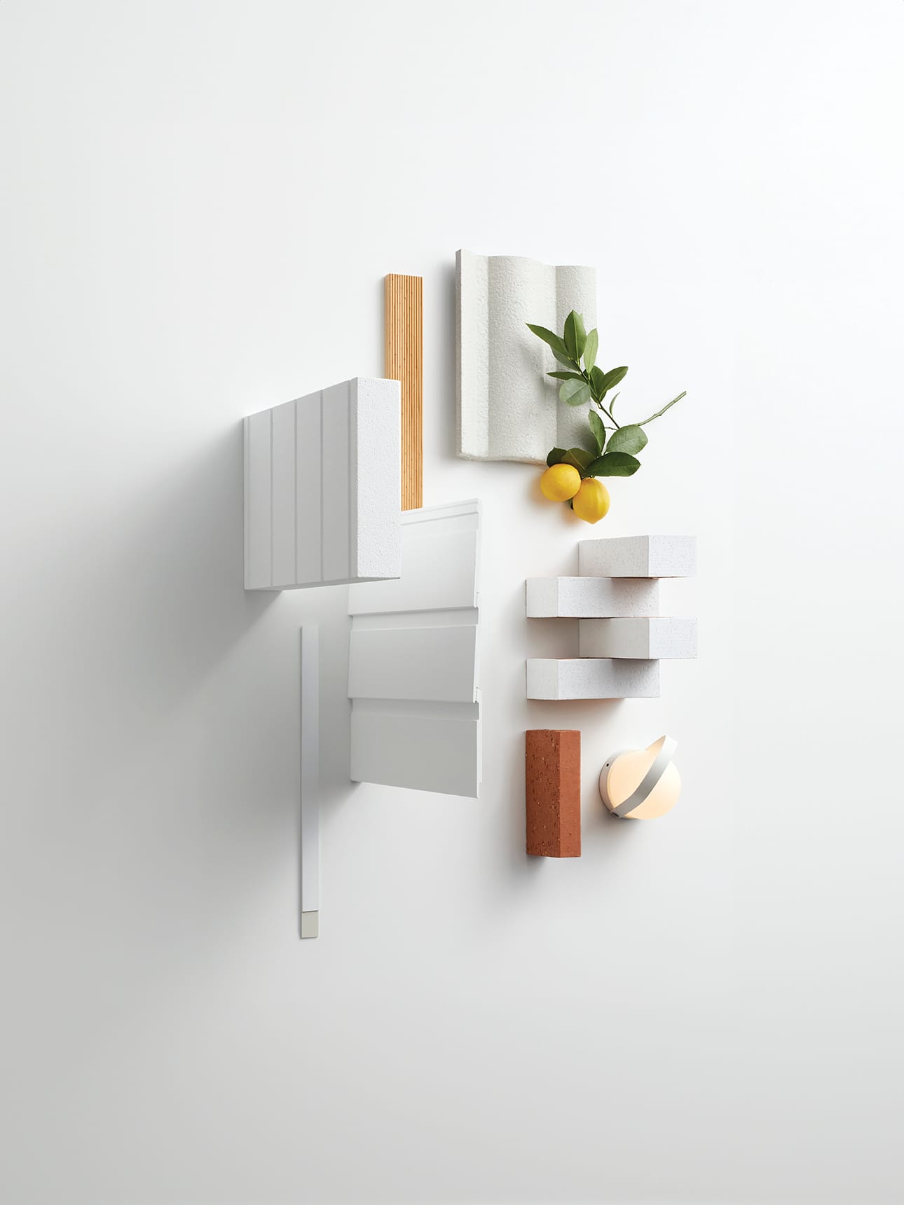 This fresh, lively palette of bright whites and playful shapes combines painted bricks and weatherboard with linear render and a distinctive roof tile. Terracotta and ribbed timber create warming accents.